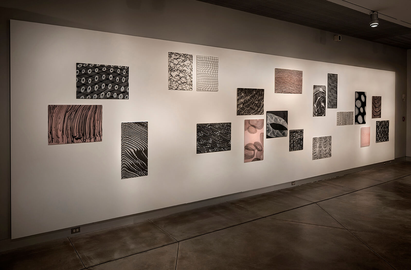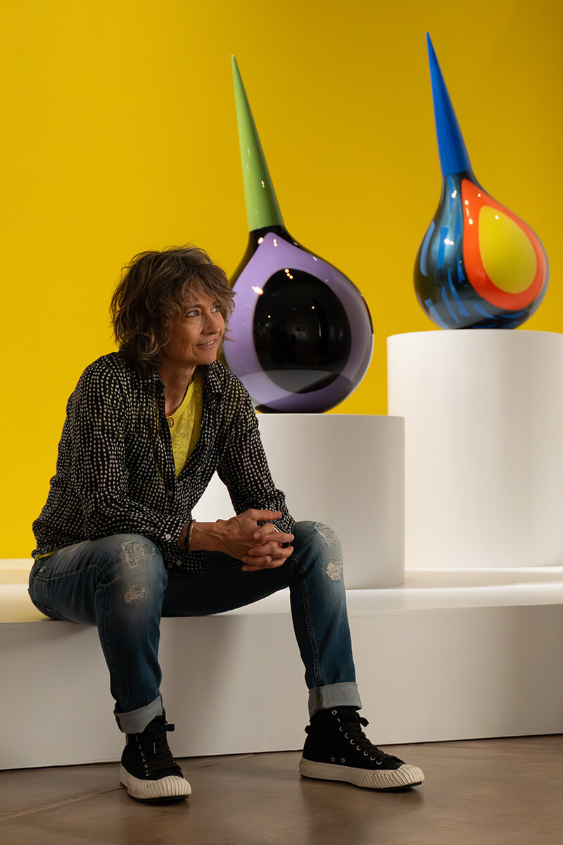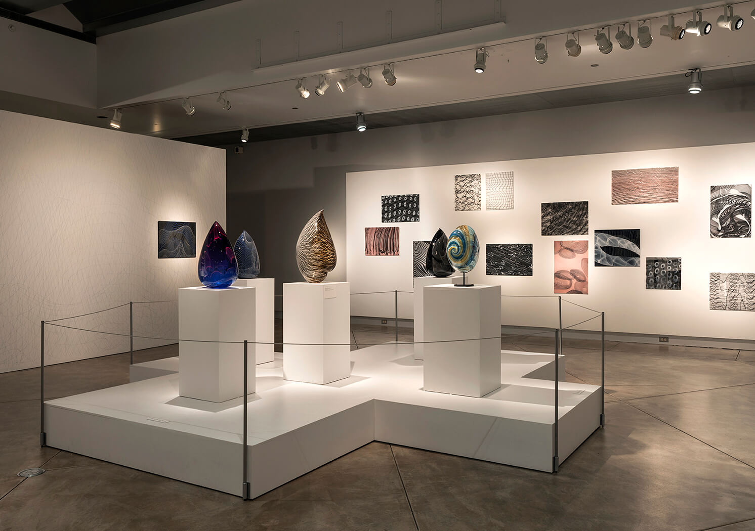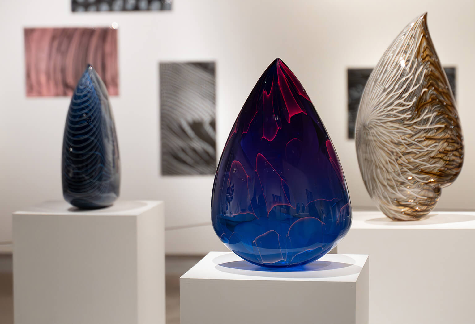 The exhibit opened with Pop Art & Graphics, a gallery of works influenced by the artist's early career in graphic design and her love of comic books, vintage pop culture and bold color. Selections included examples of a several early series: witty Medicine Bottles, Tops, striped Bee Buoys and three new Superhero Stingers. Pattern & Textile, the second theme, opened with early Winkles in plaid cane patterns, progressing to more organic and irregular textures that suggest links between fabric and glass (Palomas and Balaclavas). A nineteen-panel wall installation, Comme les Filles(2024), paid homage to avant garde designer Rei Kawakubo, whose dark and deconstructed aesthetic inspired the patterns and open composition. A central island introduced Nature and Wonders, the third theme, with five works highlighting the complexity and beauty of the natural world as interpreted in glass. A multi-panel compostion Shadow Realm (2024) featured metallic silver tones and highly textural surfaces, harnessing the reactive qualites of glass to suggest dark and mysterious dimensions of our world and cosmos. Translucent Droplets, Spires, Orbs and Space Rocks rounded out the works included in this theme.